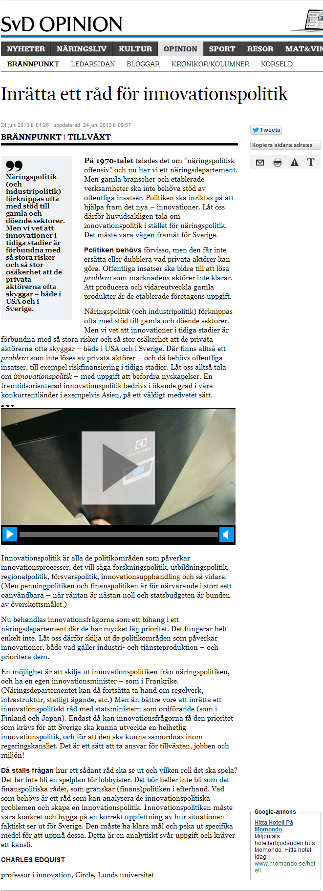 Näringspolitik (och industripolitik) förknippas ofta med stöd till gamla och döende sektorer. Men vi vet att innovationer i tidiga stadier är förbundna med så stora risker och så stor osäkerhet att de privata aktörerna ofta skyggar – både i USA och i Sverige.