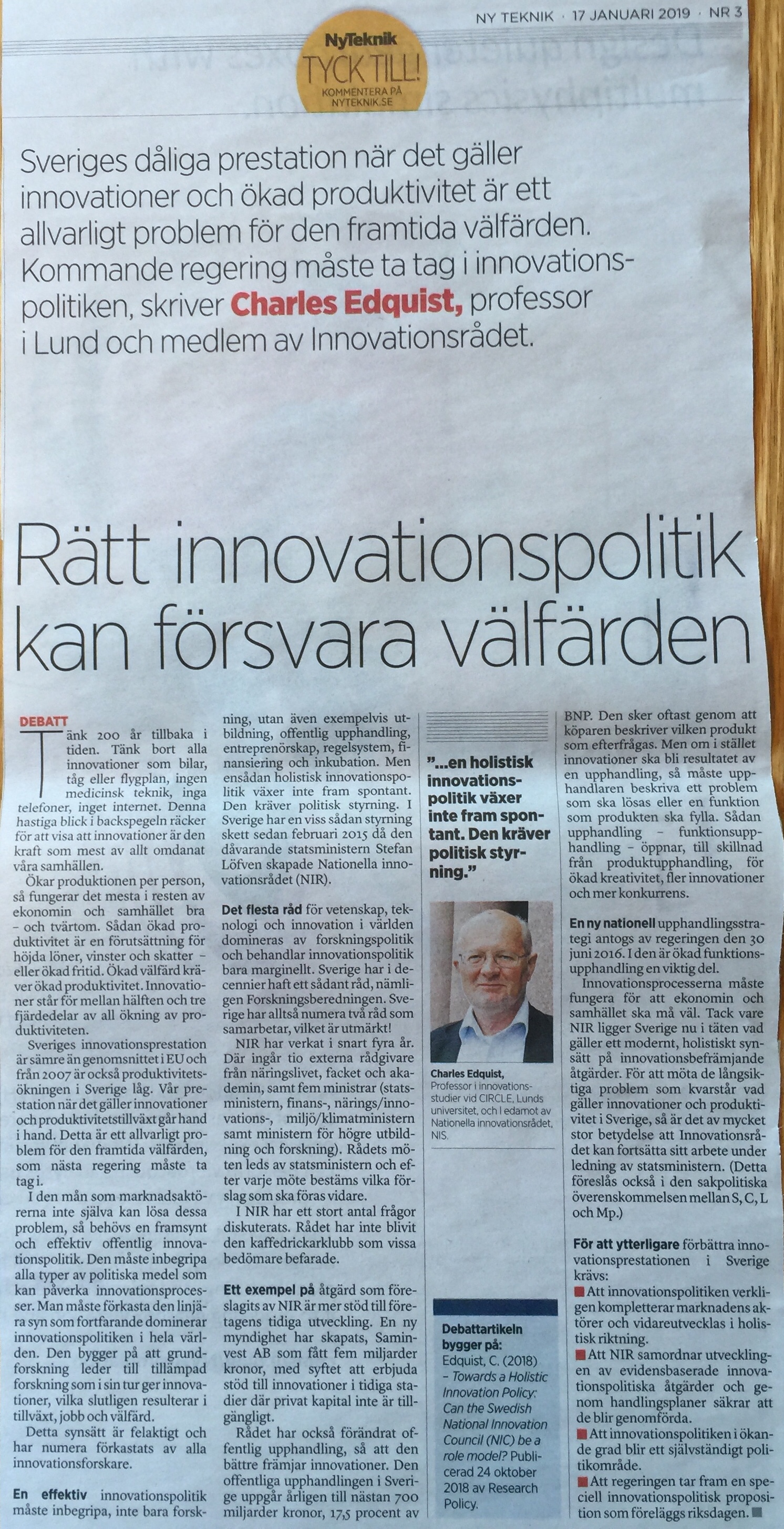 A debate article entitled Rätt innovationspolitik kan försvara välfärden. (“The right innovation policy can defend welfare” – in Swedish.) by Charles was published in the newspaper Ny Teknik on January 16, 2019. The topic is the close relation between innovation performance and productivity growth and how an holistic innovation policy can improve both and thereby contribute to higher wages, profits and taxes – or increased leisure time. Link to newspaper version. Link to Internet version, with references included.