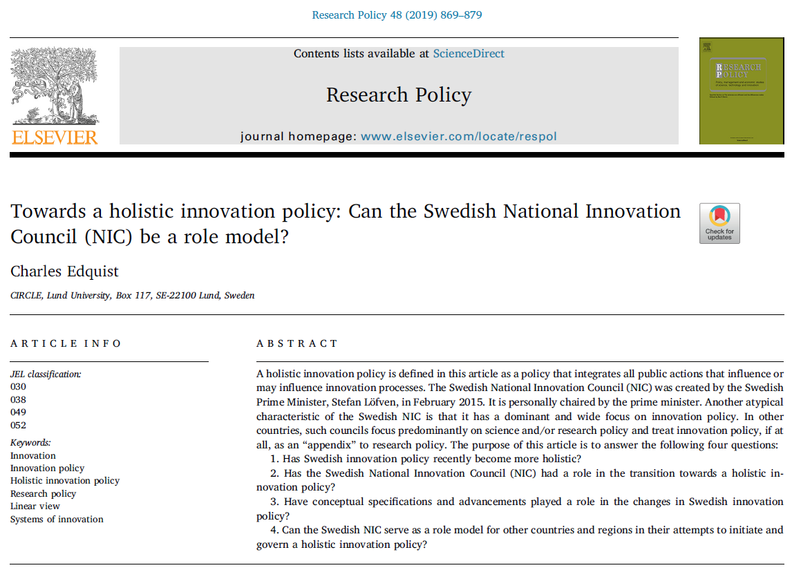 “A holistic innovation policy is defined in this article as a policy that integrates all public actions that influence or may influence innovation processes. The Swedish National Innovation Council (NIC) was created by the Swedish Prime Minister, Stefan Löfven, in February 2015. It is personally chaired by the prime minister. Another atypical characteristic of the Swedish NIC is that it has a dominant and wide focus on innovation policy. In other countries, such councils focus predominantly on science and/or research policy and treat innovation policy, if at all, as an “appendix” to research policy. The purpose of this article is to answer the following four questions: