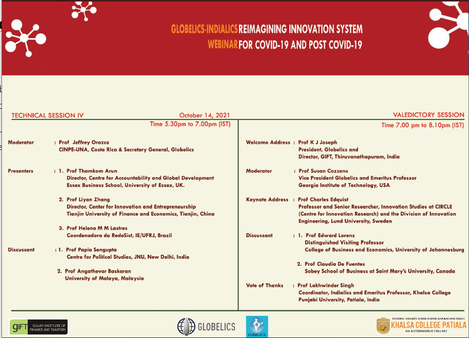 Charles took part in the Globelics-Indialics Webinar that happened between the 12th and the 14th of October, 2021. The webinar took place via Zoom, and the theme was “Reimagining Innovation Systems for COVID-19 and Post COVID-19”.