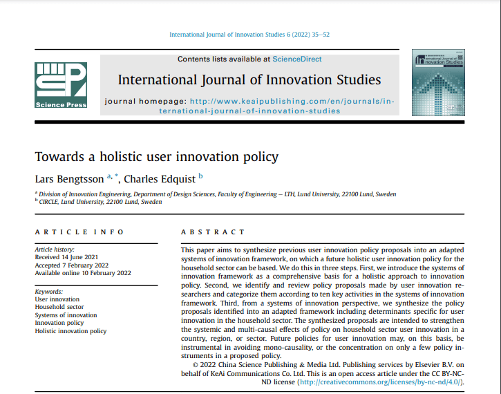 Lars Bengtsson’s and Charles’ article “Towards a Holistic User Innovation Policy” has now been published in the International Journal of Innovation Studies last February 7th, 2022.