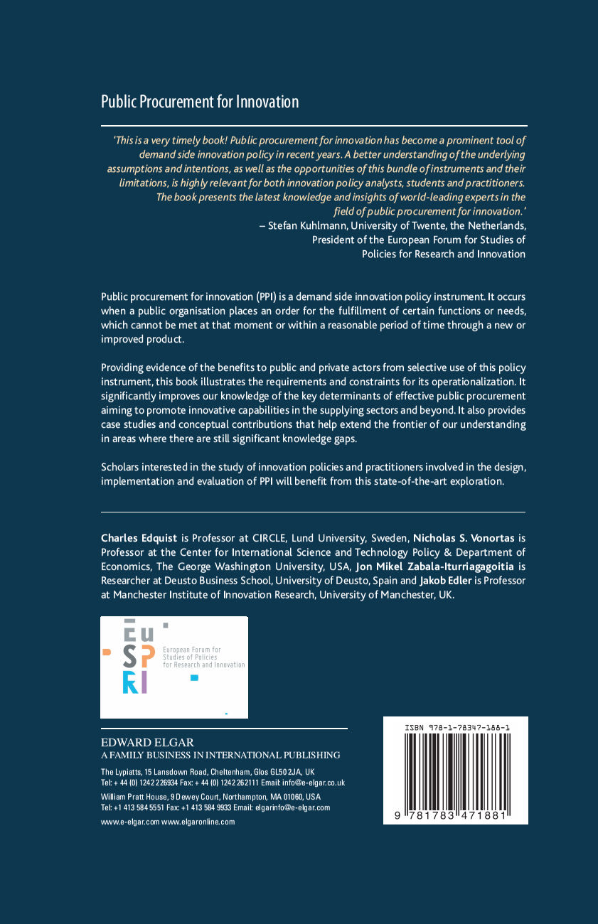 ‘This is a very timely book! Public procurement for innovation has become a prominent tool of demand side innovation policy in recent years. A better understanding of the underlying assumptions and intentions, as well as the opportunities of this bundle of instruments and their limitations, is highly relevant for both innovation policy analysts, students and practitioners. The book presents the latest knowledge and insights of world-leading experts in the field of public procurement for innovation.’